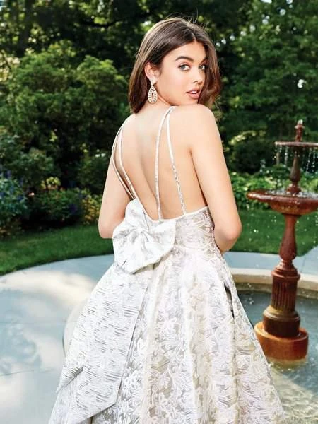 You are sure to be the life of the party when you are wearing this dazzling Clarisse 5050. This brocade dress fashions a sleeveless, V-neckline and a dual strapped back. A large bow detail accents the back while the skirt opens in an elegant A-line silhouette. This Clarisse creation is truly remarkable!