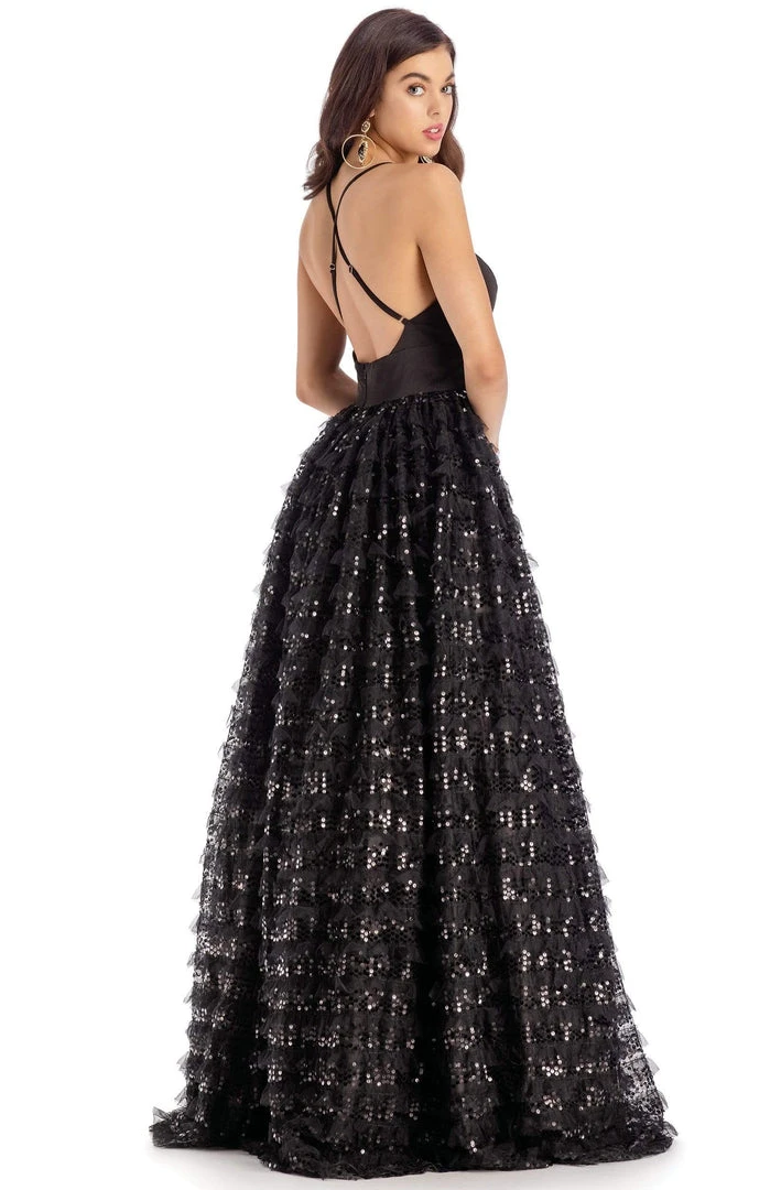 | Details: | Plunging V-Neckline with Mesh, Fitted Bodice, Crossed Scoop Back, Zipper Closure, Sequined Ball Gown, Sweep Train |