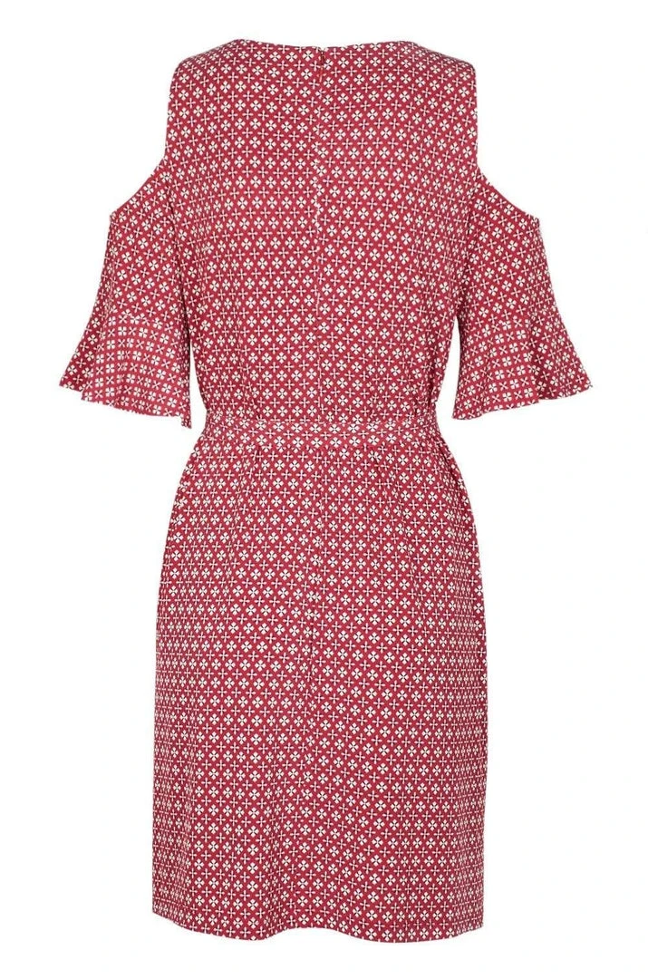 | Details: | Cutout shoulder, Tie waist, Multi-print, Jersey, A-line skirt, Back zipper |