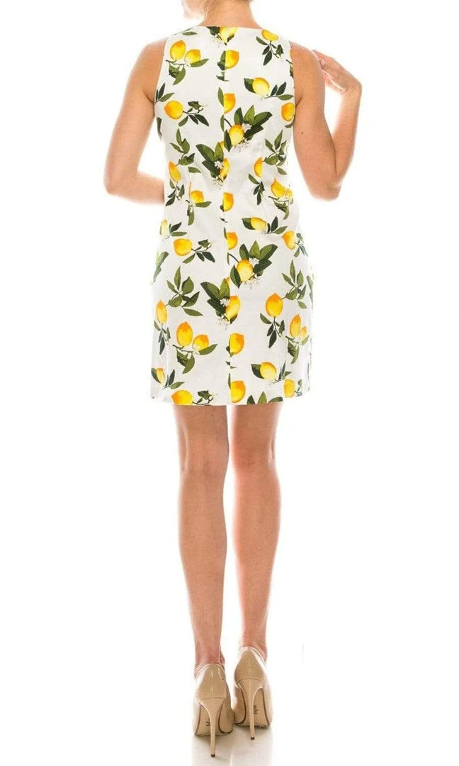 Look like a breath of fresh air in this vibrant London Times T4643M creation. Accented with tailoring seams on a lemon print silhouette, this dress shows a jewel neckline with a full back. The sheath skirt skims to a short hemline. Leave a trail of admirers when slipping on this London Times masterpiece.