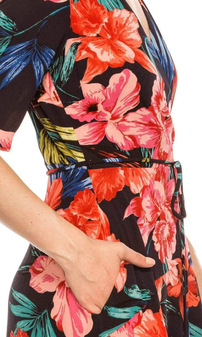 Flaunt your feminine flair in full bloom in this Maison Tara 91071M creation. Vibrantly printed with floral details, this stunner charms with a surplice v-neckline with short sleeves. Designed with a zippered full back and a thin tie waist, the tiered skirt flows into a tea length hemline. Have all eyes gravitate towards you in this Maison Tara masterpiece.