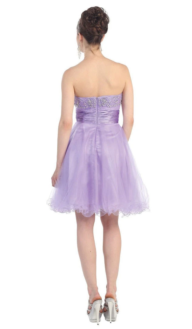 Revel in the exquisite sensation of pure luxury as you inspire in this May Queen MQ700 creation. Beautifully parading horizontal micro-tucks festooned with ornate jewels, this beauty shows off a strapless, modified sweetheart neckline paired with a bejeweled open back. Nipped with a shirred cummerbund the midriff, the gossamer layered A-line skirt flourishes a rolled short hemline. Capture the dazzling quality of the night with your glistening style in this May Queen masterpiece.