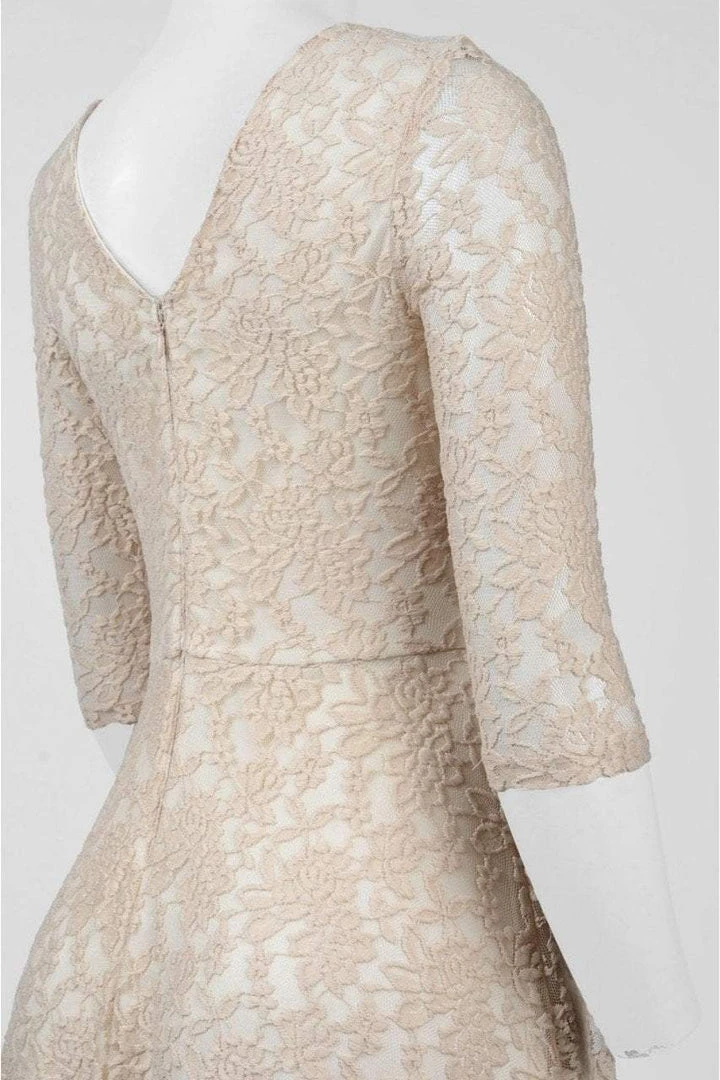 Mesmerize with your utter femininity and exquisite style in this romantic Sangria AMYKV27 creation. Fancily enfolded in an intricate floral lace overlaying a sculpted bodice, this lovely beauty reveals a jewel neckline flanked with sheer quarter sleeves and a v-cut open back. Seamed around the waist for that impeccable fit, the layered A-line skirt gushes with soft pleats and completes at a modest tea-length hem. This dainty Sangria masterpiece gives an airy elan to your spectacular special night.
