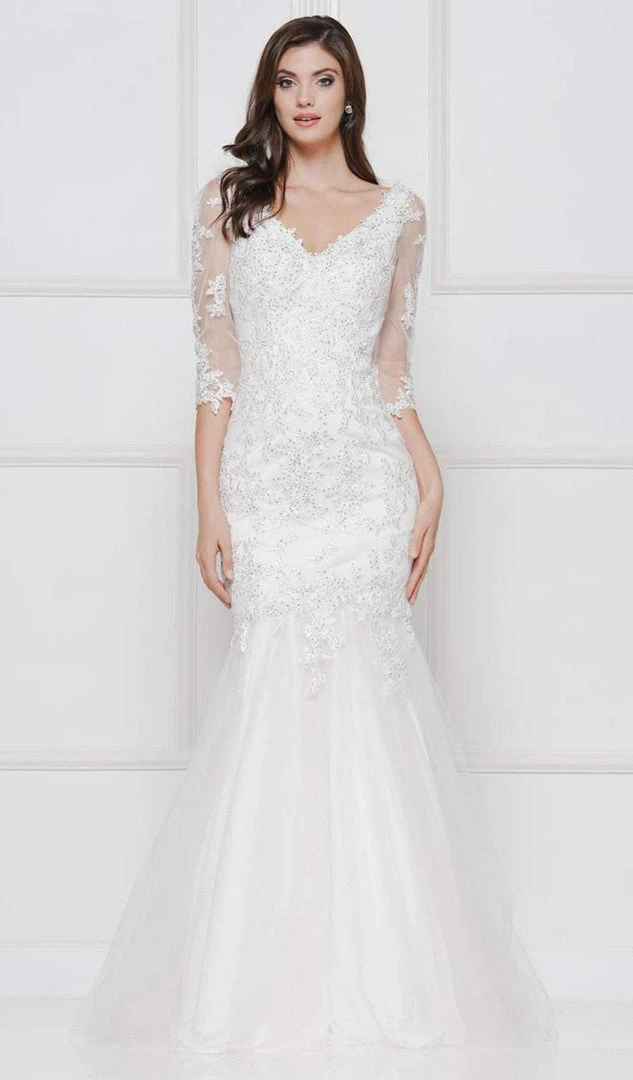 Get ready for everyone to stop and stare when you show up in this dress by Glow by Colors G290SL-1. Showcases in a V-neckline with sheer quarter length sleeves. Made of lace appliques and bead embellishments, the fitted bodice has a V-back and the skirt sculpts your shape in a trumpet silhouette. Be in this gorgeous Glow by Colors creation and leave a lasting impression.