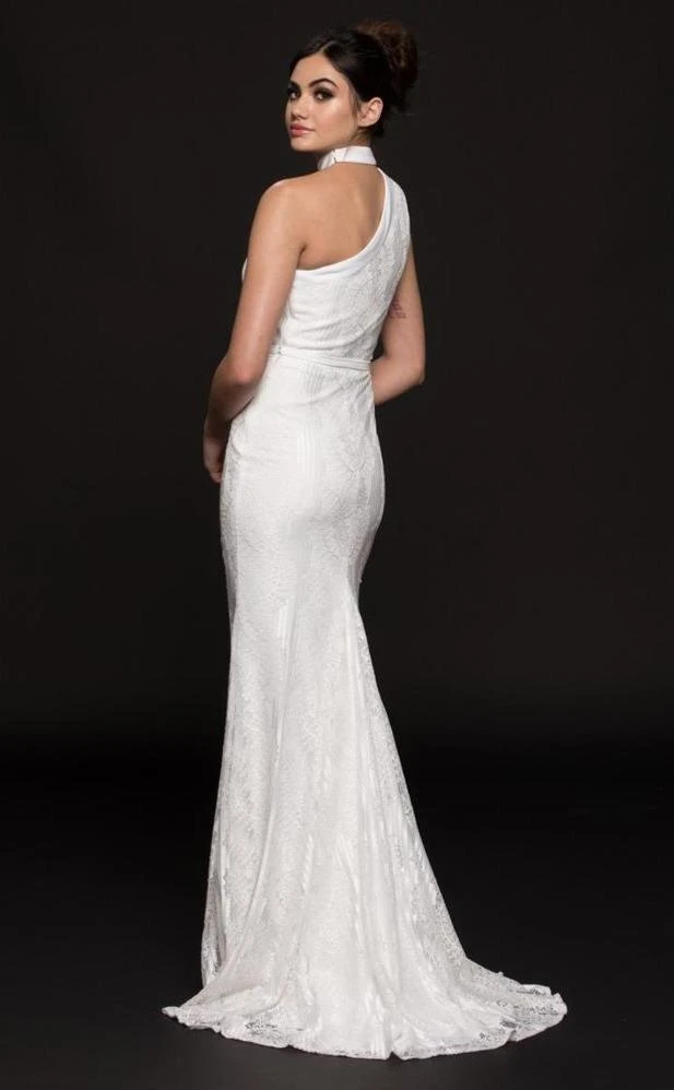 | Details: | Fitted, Sleeveless, Asymmetrical Bodice, Thin Waistband, Floor Length, Sweep Train |