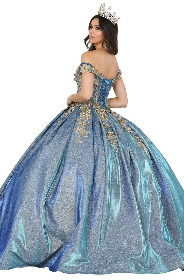Walk in glamour and let all heads turn on you in this creation by Dancing Queen 1504. This embroidered gown features sweetheart neckline with an off-shoulder sleeves and a corset bodice. From the waist begins a pleated ballgown skirt. A sure winner from Dancing Queen creation!