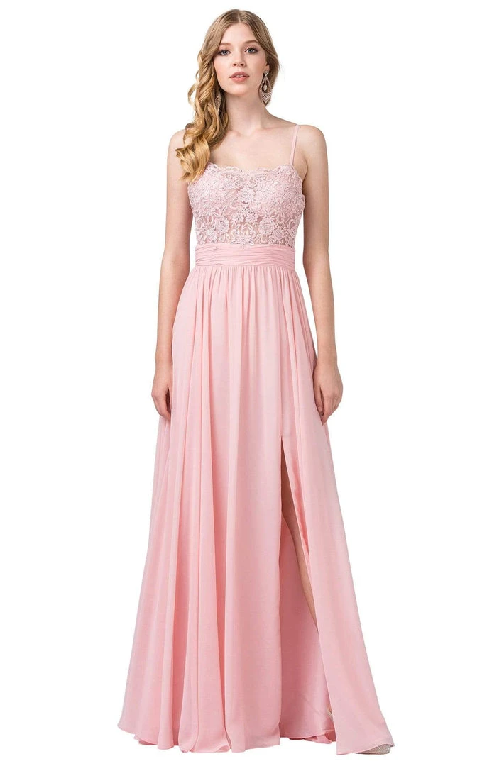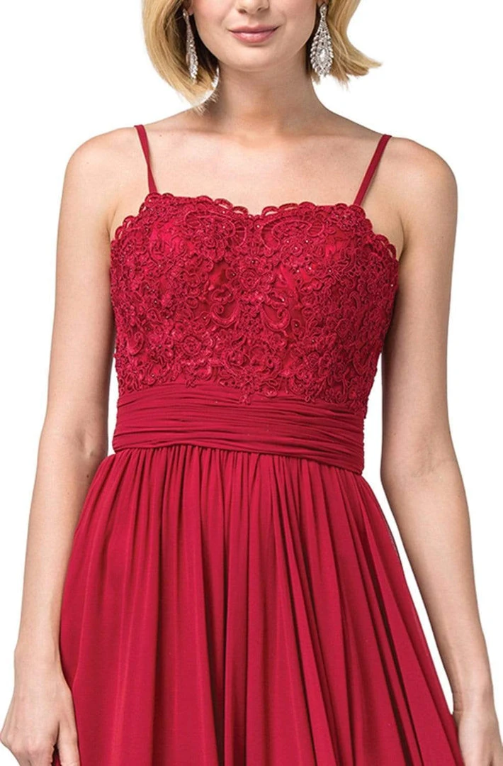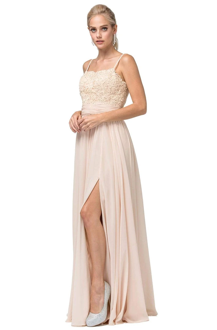 Make it a night to remember with this divine Dancing Queen 2789 dress. A square neckline with fine straps crowns the sleeveless bodice covered with stunning lace embroideries and adorned with scattered beads. This lovely piece has wide ruched waistband that accents the natural waist. Soft movements grace the chiffon skirt as it flows down to floor length hem. Bring on the glam with this lovely evening dress. Be a mesmerizing sight to behold as you flaunt your subtle sophistication in this creation by Dancing Queen.