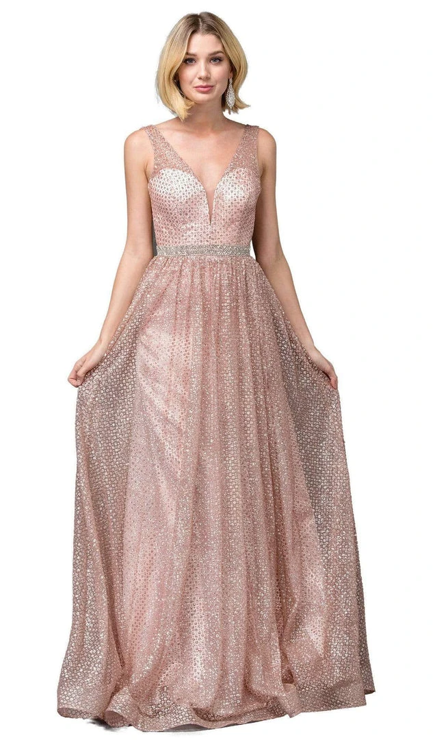 Be dressed up stunningly in this attractive Dancing Queen 2834 evening gown. This shimmering ensemble features a fitted bodice with a plunging V neckline with sheer inset panels at the bust and sides. Striking beaded belt accents the natural waistline as it gives way to the pleated a-line skirt that falls to the full length hemline. The sheer back is open, secured with a center zipper closure. Beam with pride as you don this Dancing Queen piece.
