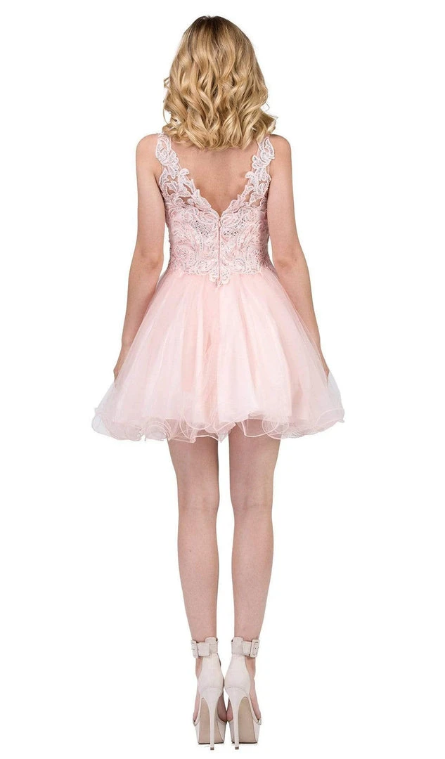 You’ll love twirling at the dance floor with this fabulous homecoming cocktail dress by Dancing Queen 3022. Beautifully embroidered and beaded, the fitted bodice showcases a distinct V neckline mirrored with a V back. This dress features a tulle A-line skirt which flares to the mid-thighs and finishes with curled hemline. Securing the back for a figure flattering fit is the center zipper closure. Sassy and charming, this dress by Dancing Queen will make you the darling of the party.