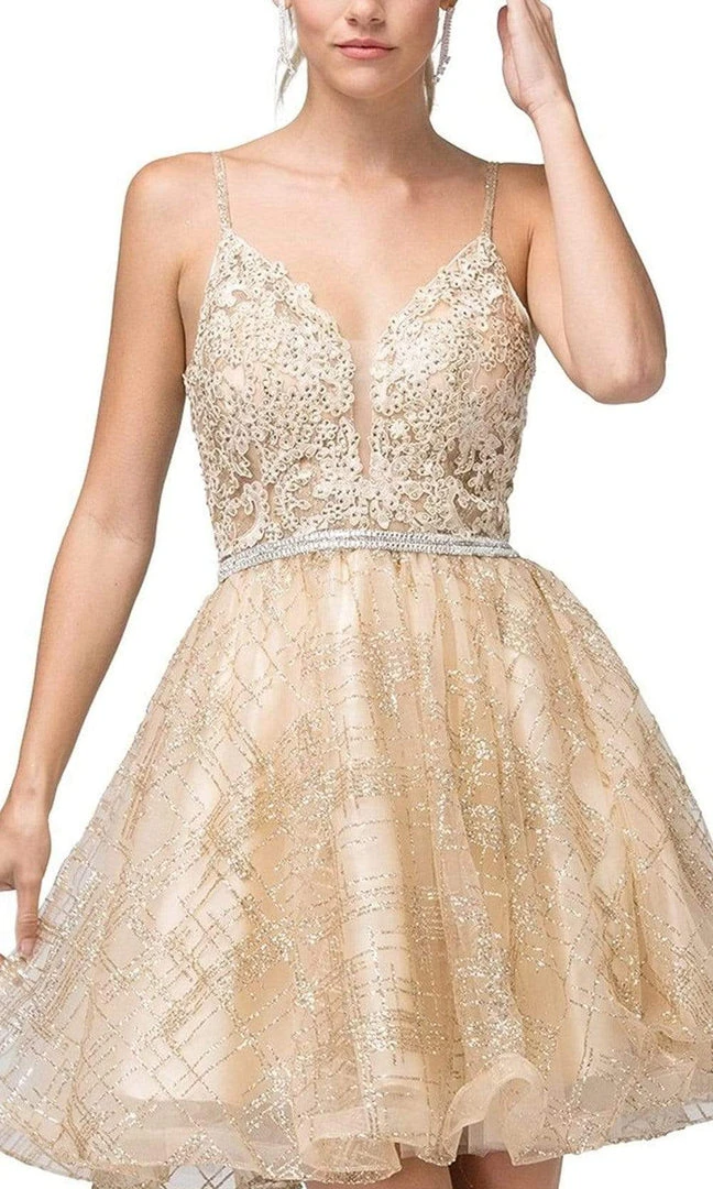 Sparkle in beauty wearing this look by Dancing Queen 3152. This embroidered cocktail dress showcases a sleeveless, deep V-neckline with spaghetti straps. The back is styled with a low V-back and the waist is cinched in an embellished belt. The skirt is tailored in a flirty A-line silhouette and runs at mid-thigh hem. Be ready to capture the spirit of that romantic evening in Dancing Queen.