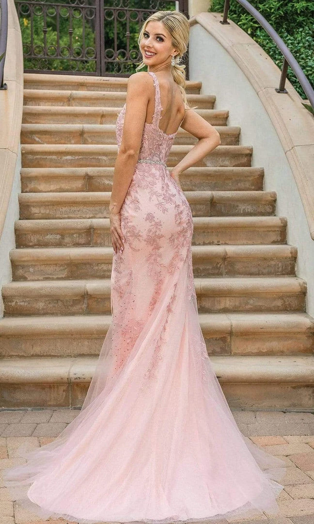 Get that royal look with this beautiful Dancing Queen 4212 evening dress. This prom dress fashions a plunging V-neckline in a fitted and appliqued bodice with beaded waist. Revealing a sheath silhouette skirt with slit, this also shows a mid-open back to complete the look. Draw out the princess in you with this Dancing Queen creation. Model is wearing Blush color.