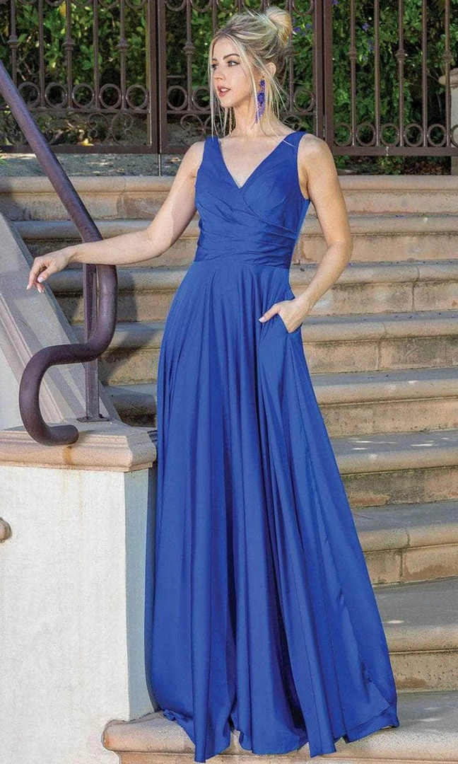 Be dazzled with the sleek beauty of this Dancing Queen 4262 creation. Ornamented with wide pleats that crafts into a faux wrap bodice, this piece reveals a v-neckline with tapering shoulder straps. Intricately cinched with a corset styled back, the gleaming skirt cascades to touch the floor with a sweeping denouement. Embrace the fascinating style of this gorgeously sleek Dancing Queen masterpiece. Models are wearing the Burgundy, Copper, Dusty Blue, Hunter Green, Navy, Plum and Royal Blue colors.