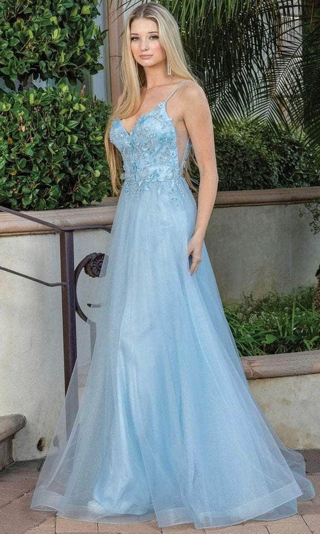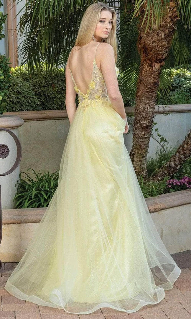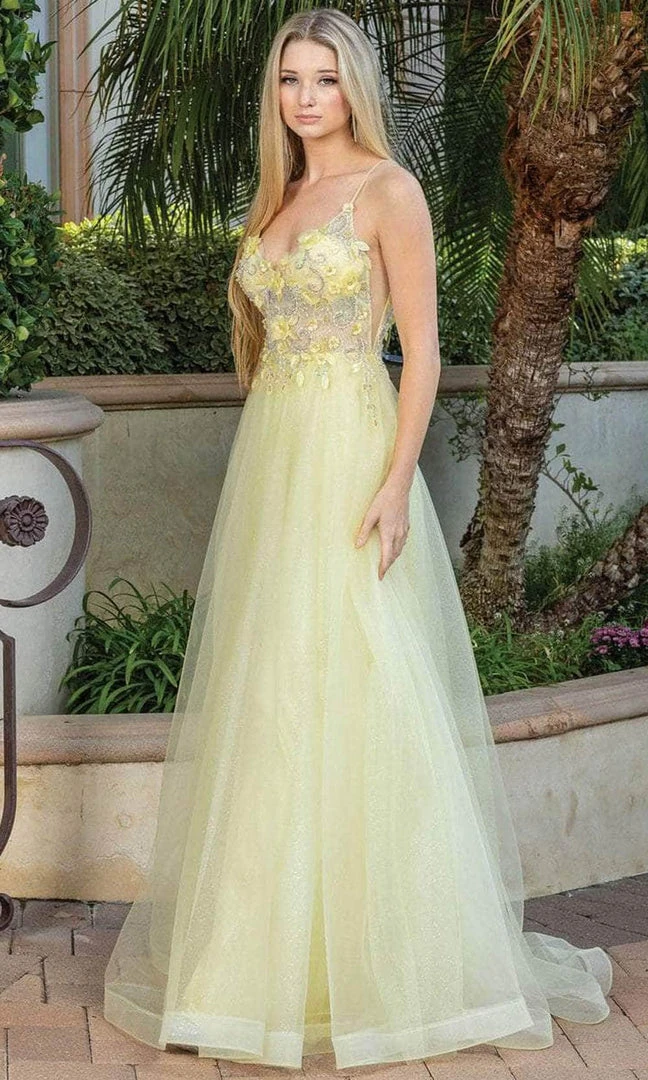 Bloom with loveliness in this floral long dress from Dancing Queen 4276. This figure-flattering piece features a sleeveless bodice adorned with floral applique that is beautifully embellished with beads, this is very suitable for any occasion. Thin straps are used to hold this masterpiece and lead to a V-shape back supported with a back zipper closure. The skirt is a stunning A-line silhouette from tulle fabric. This Dancing Queen dress is sure to make a bold statement on that special occasion! Models are wearing Bahama Blue, Blush, Hunter Green, and yellow colors.