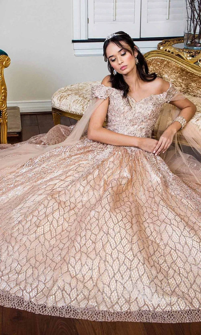 Parade the elegant and stunning side in this Elizabeth K GL1926 evening dress. The whole ensemble is designed in glitter embellishments as the fitted bodice showcases an off shoulder neckline and cut-away shoulders. The skirt graces a ballgown silhouette. Have all eyes on you as you show up in this Elizabeth K creation.