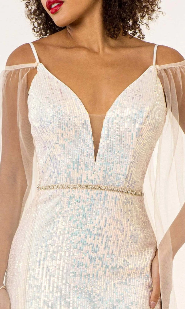 Flaunt your figure in this fabulous dress by Elizabeth K GL1955. Shimmer and shine in this embedded with mini-sequins all throughout. It uses spaghetti straps with cape sleeve using mesh fabric that runs down to the hem-length. It features plunging neckline and V back while the silhouette used is sheath in full length. Embrace a style that is immaculately sultry as you glam up for your event in this Elizabeth K creation.