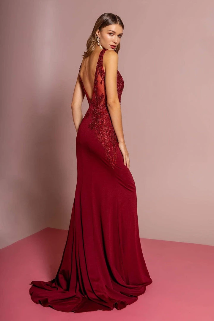 Exude that vibrant personality in this ravishing dress by Elizabeth K GL2614. This rome jersey dress delights in a sleeveless, deep V-neckline with bodice elegantly ornate with lace appliques. The back flaunts a low V-cut and has a zipper closure. Radiate class and poise as you dance all night long in this timeless Elizabeth K masterpiece.