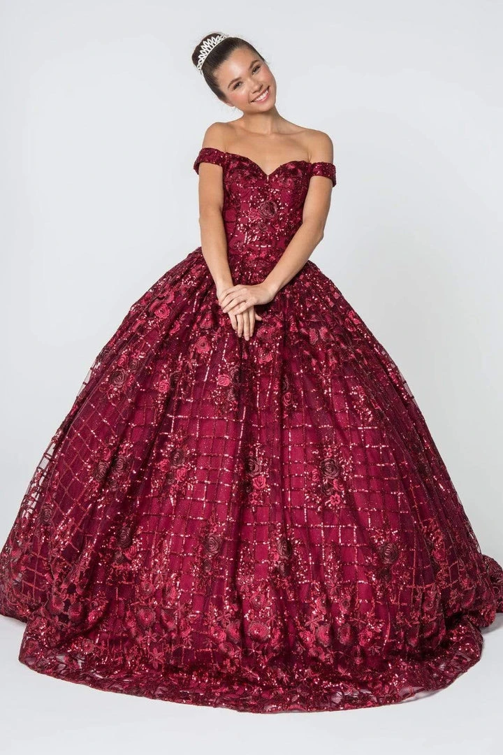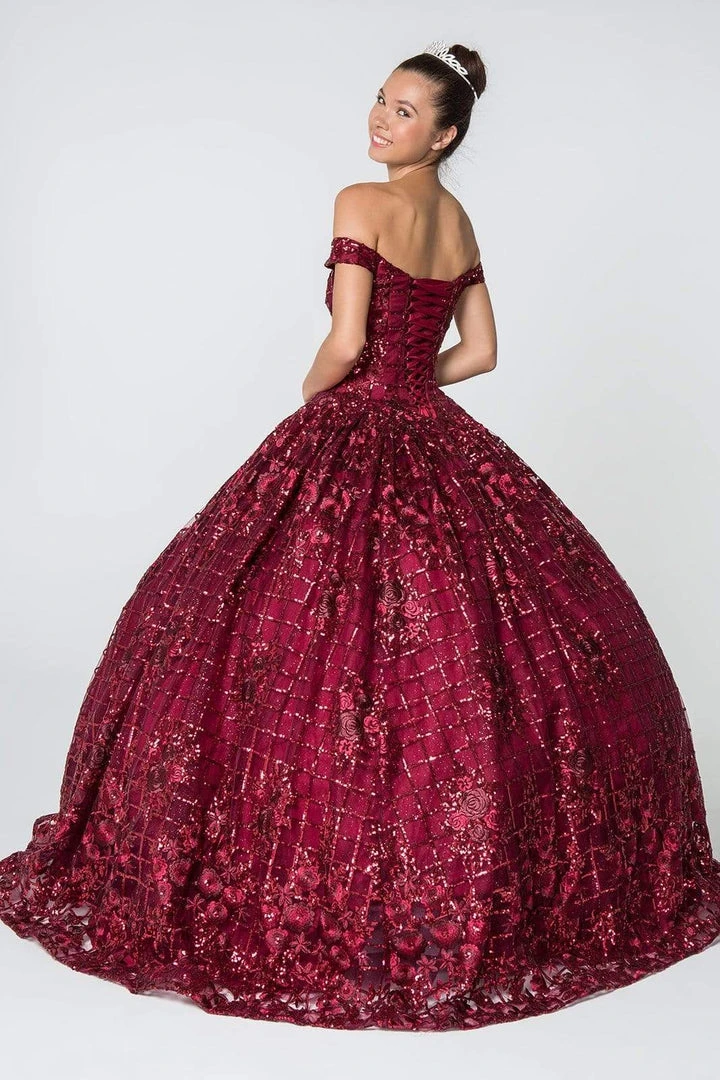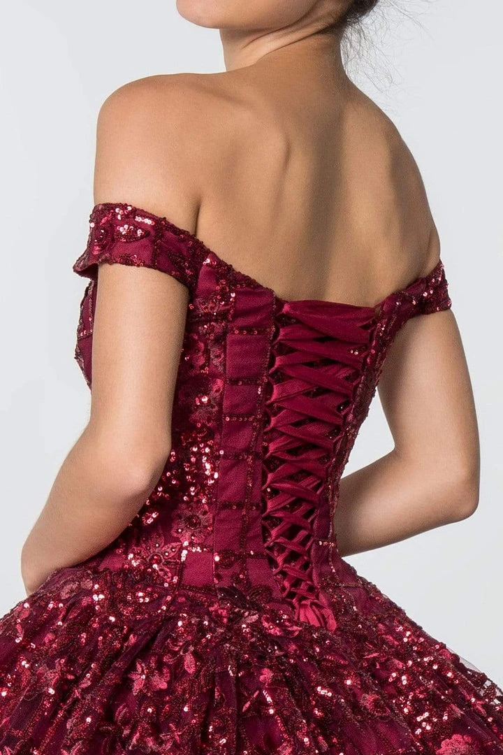 Make it a night to remember with this majestic Elizabeth K GL2803 masterpiece. Fully designed with sequin embellishments and floral embroideries, this stellar piece features a fitted bodice framed with a sweetheart notched off-shoulder neckline. Adorned with fabulous pleats, the ballgown skirt glamorously cascades to the floor as the mid-open back is secured with lace up corset closure. Be the spotlight at your upcoming social event wearing this extravagant Elizabeth K ensemble.