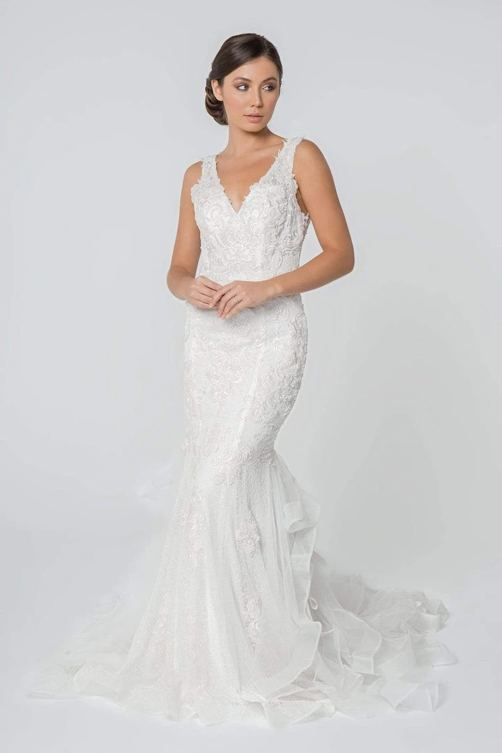 Look absolutely breathtaking in this glamorous Elizabeth K GL2814 bridal dress. The fitted bodice is embroidered for a lacy effect framed with a V neckline, supported with thick straps which lead to the open U back. The skirt parades a mermaid silhouette beautifully designed with layers of ruffles that sophisticatedly flares to the floor, finished with a sweep train for added drama. Elizabeth K wedding dress boasts undeniable fascination in a chic silhouette.
