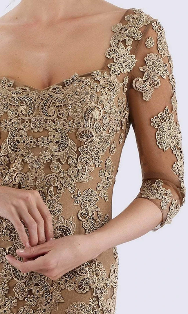 Brandishes with quarter length sleeves and a sweetheart neckline. The entire dress is embellished with lace appliques. The fitted bodice gives way to a full length sheath skirt. Model is wearing Bronze color.
