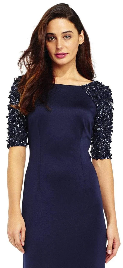 Capture the glamour as you walk on this gorgeous Adrianna Papell AP1E201359 creation.The dress brandishes in a bateau neckline with sequined and embellished quarter length sleeves. The back has a V-shaped cut that connects to the back zipper while the waist is accented with visible seams to show the perfect fit. Finishing the look is a sheath skirt that runs in full length hem with a center back slit. This Adrianna Papell creation will sure to display your natural beauty and grace.