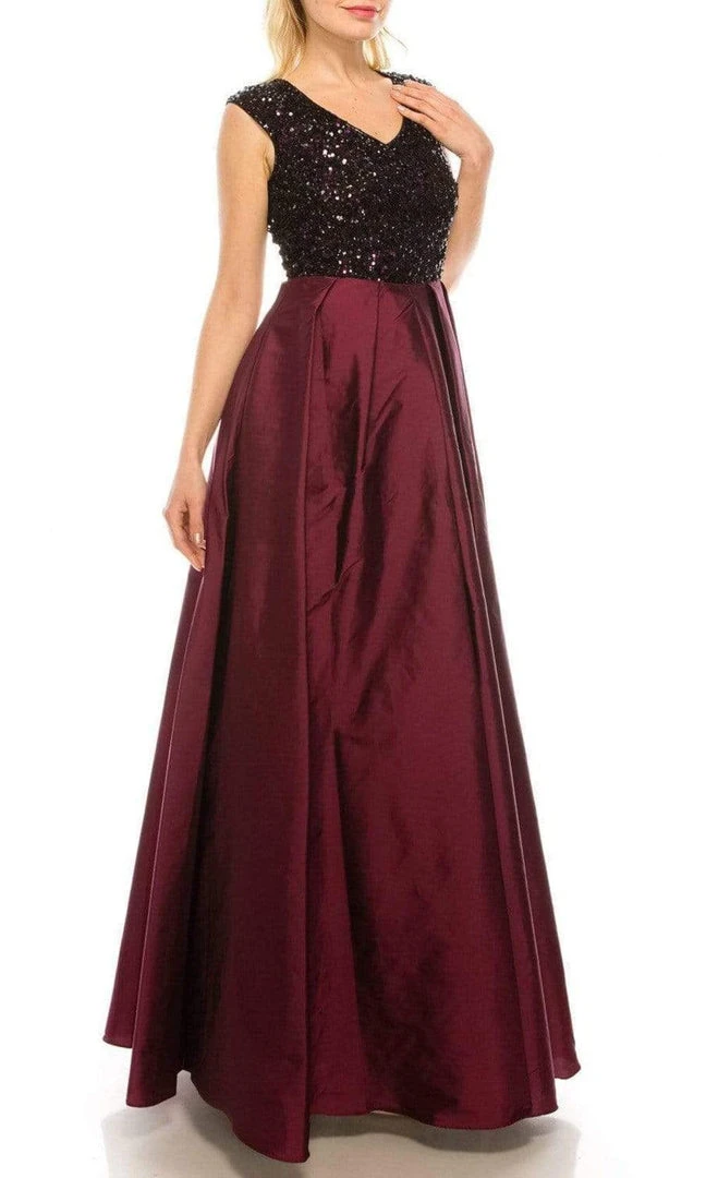 Showcase your stunning side in this glamorous evening dress by Aidan Mattox 54465580. Striking sequins design the bodice, framed with a V neckline and cap sleeves, complemented with a full zipped up back. Box pleats adorn the a-line skirt as it finishes to a full length hemline. Create a perfect evening with this Aidan Mattox creation.