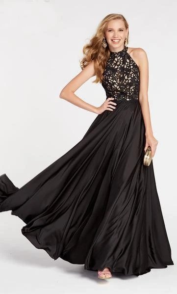 Walk the red carpet stunningly in this wonderful evening gown by Alyce Paris 60298. Tailored in lace with nude underlay, the fitted bodice offers a high halter neckline complemented with a strappy open back. The satin chiffon a-line skirt adorns fabulous pleats as it tapers to full length. The open back features multiple straps for added support. Strike a grace note in this stunning evening gown by Alyce Paris.