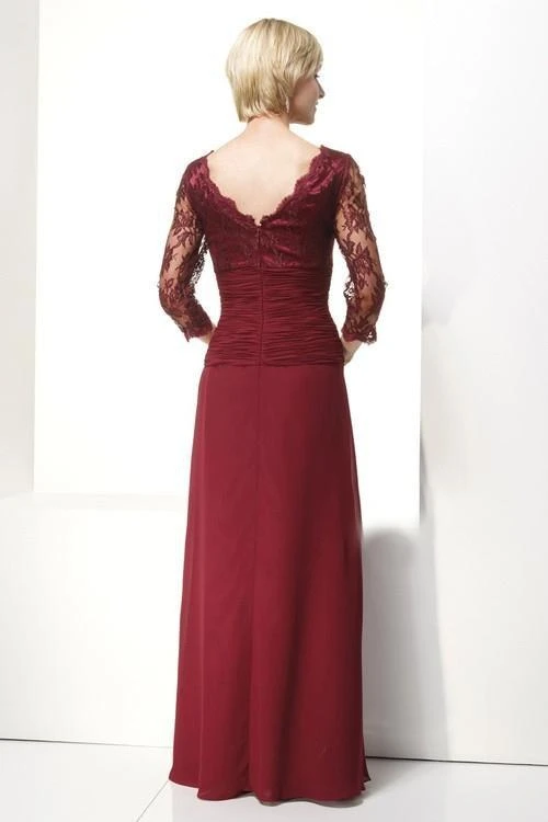 Look and feel glamorous in this evening gown by Alyce Paris Black Label 29364. Subtle beads and floral lace overlay the gown’s ruched bodice. This is perfected by a V-neckline emphasized with scallop lace trim. The V-shaped back reflects the lavish front design. The coordinating sheer lace sleeves look opulent. The ruched waist fashions a soft silhouette. The smooth A-line skirt delicately gathered near the waist and cascades to the floor. This chiffon and lace creation from Alyce Paris Black Label collection is a must have. Model is wearing a Burgundy, Blue Coral, Pale Jade, and Stone color.