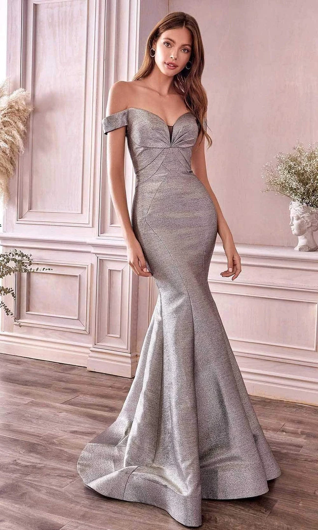 This iridescent metallic jacquard dress flourishes an off shoulder sweetheart neckline with a pleated bust and sheer inset panel. It has a form-fitting bodice and a mermaid skirt styled with a sweep train while the back highlights a mid-open cut and zipper closure to complete the look. Dress is pictured in Opal Blue, Opal Pink and Opal Silver. colors.