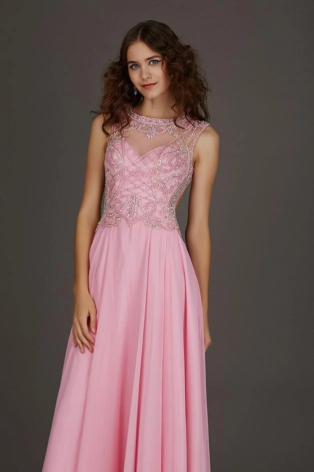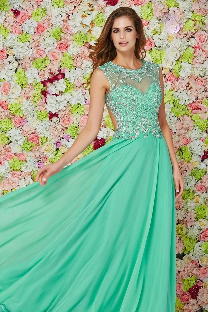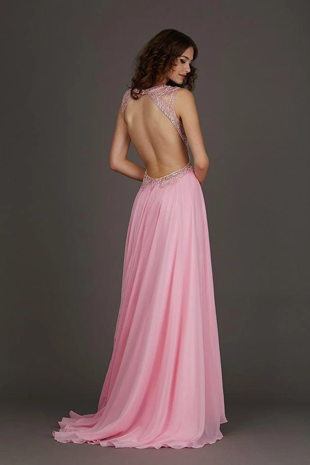 Twinkly rhinestones over embroidered lace frame the sweetheart illusion neckline of this airy chiffon prom dress that has an open back.