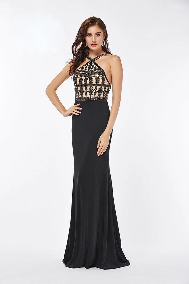 This stunning floor length halter dress will be the most glamorous dress at your prom. The halter bodice is detailed with embellishments, which adds a nice feminine touch. Pair this halter dress with silver drop earrings, and you will be all set for a night to remember.