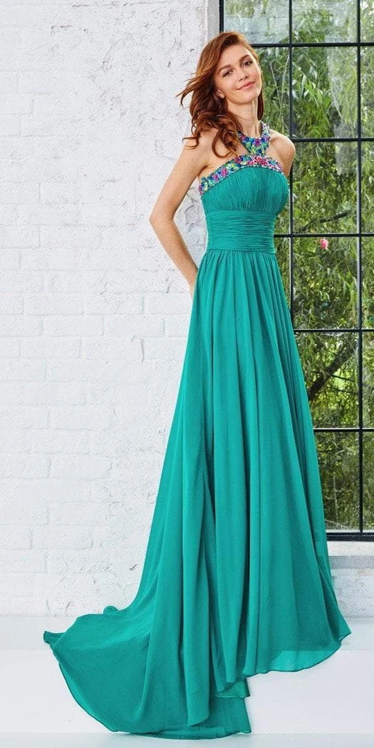 Be ready to amaze everyone in Angela & Alison 771044. A lovely flowing chiffon gown with ruched waist and bodice, embroidered trim halter neckline and crisscross multi-colored floral back straps. This luxurious and chic look by Angela & Alison is a sure breathtaking and is sure to turn heads when you walk into the room at prom or any formal occasion.