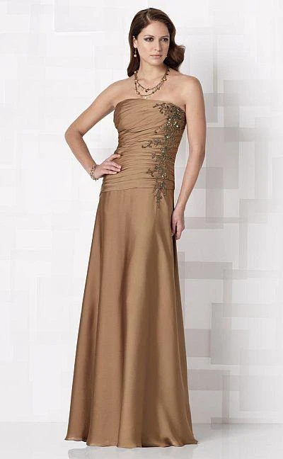 Strapless satin faced chiffon A-line dress, asymmetrically ruched bodice accented with side hand-beaded applique and asymmetrically dropped waistline, sweep train. Removable straps included.