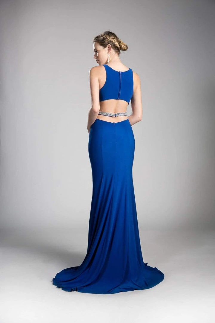 Bring an element of allure that captivates in this Cinderella Divine 62806 creation. Crafted in a stretch knit fabric showcasing bold tones, this chic piece shows a jewel neckline on a sleeveless bodice with a peaked illusion front panel. Crafted with a back defined with a notched low open back traversing to gorgeous side cutouts. Crowned with a beaded inverted basque band, the sheath skirt has illusion panels that cascade down to the floor along with a sweep train. Glow with immaculate poise in this impeccable Cinderella Divine masterpiece.
