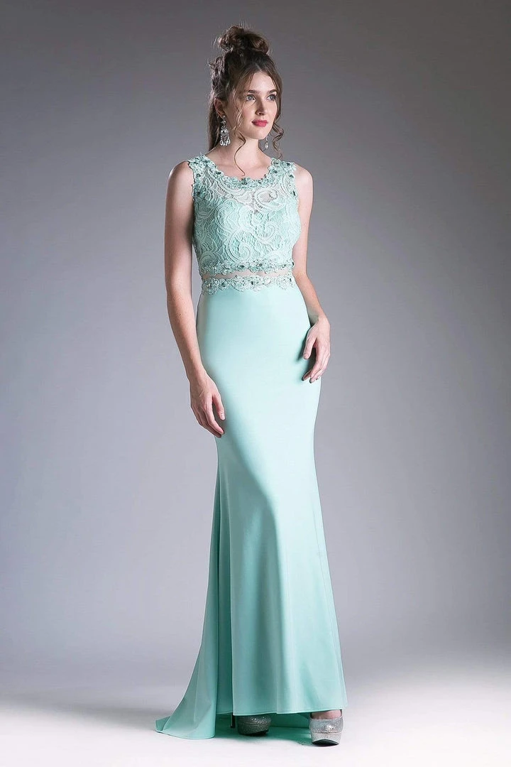 Look fantastic for your next formal event in this evening gown by Cinderella Divine CF115. This elegant dress showcases a sleeveless, scoop neckline in a sheer lace bodice with sweetheart shaped under layer. Sparkling beads embellished the lace applique that trims the neckline, armhole and the midriff. The floor length smooth sheath skirt creates an elegant finish to the dress. Capture the glamour as you walk on this stunningly gorgeous Cinderella Divine creation.