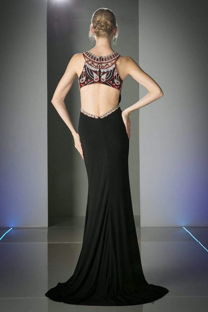 Sparkle in beauty wearing this dress by Cinderella Divine CK58. Envisions a sleeveless, halter neckline with bodice adorned with intricate beading. The fitted bodice flaunts a sexy open back and the skirt forms a sheath silhouette with a sweep train finish. Make a splash in this look from Cinderella Divine.