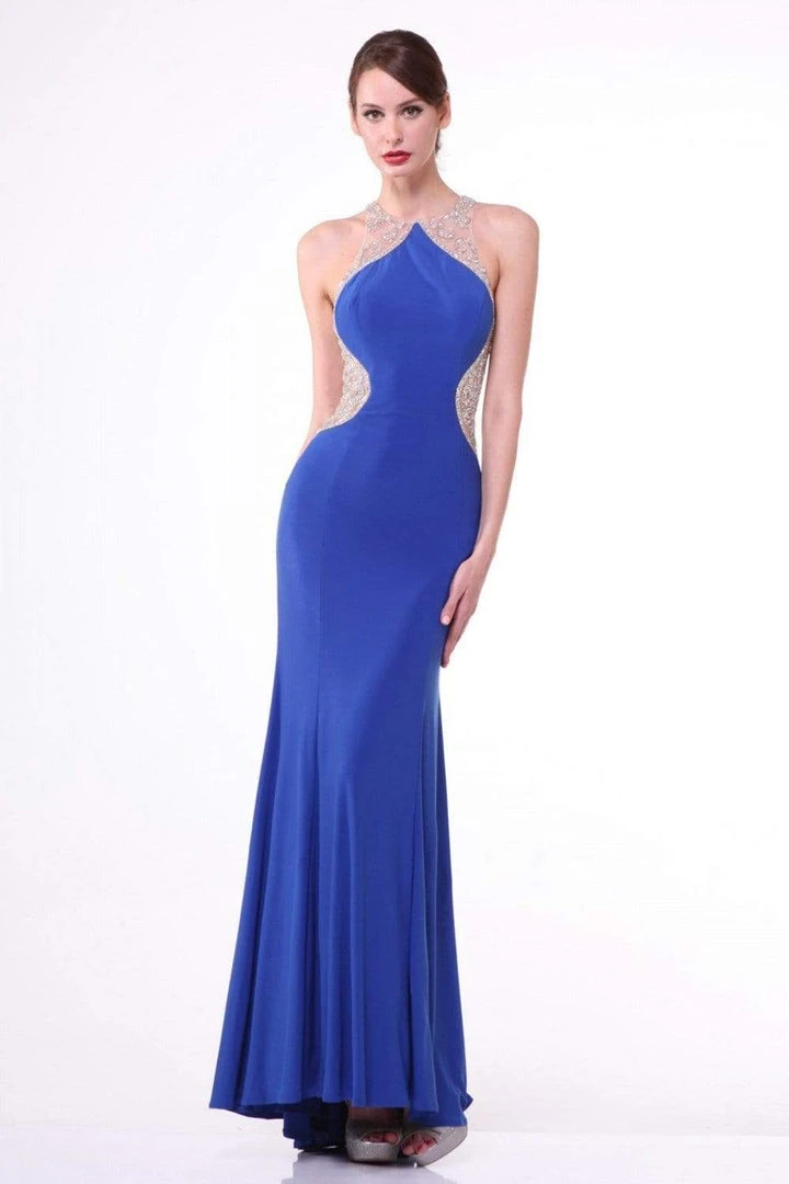 Look brilliant for your special event wearing Cinderella Divine 8752. Brandishes in a sleeveless, illusion halter neckline with fitted bodice bedecked with glittering embellishments. The racerback has a zipper closure and forms a full length sheath skirt with sweep train. Make an extraordinary statement when you walk in this classy Cinderella Divine dress.