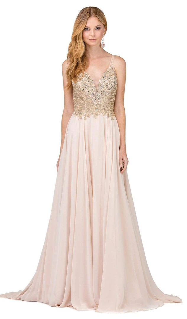 | Details: | Fitted, Sleeveless, Thin Straps, Sheer Inset Detail at the Buts, Beaded Bodice, Chiffon Soft Pleated Skirt, Floor Length, V Back, Back Zipper Closure, Sweep Train |