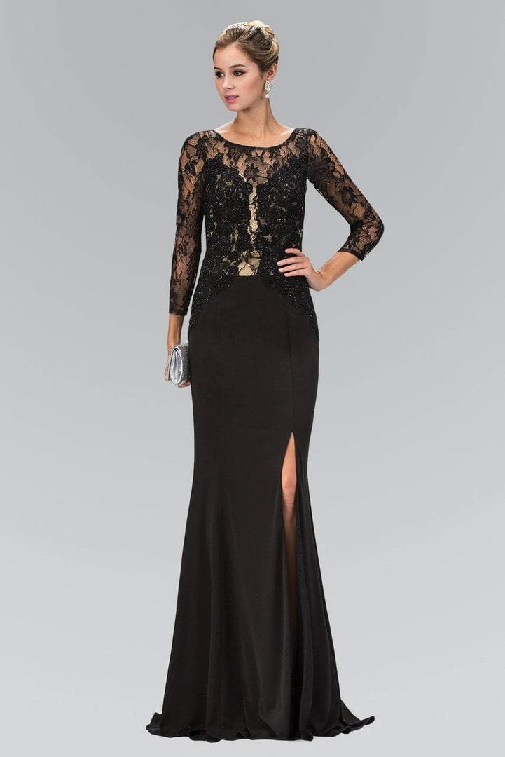 Get ready for everyone to stop and stare when you show up in this evening dress by Elizabeth K GL1371. The dress features a beaded lace bodice, three quarter sleeves, bateau neckline, open back and a sheath silhouette jersey skirt with side slit. Be in this gorgeous Elizabeth K creation and leave a lasting impression!