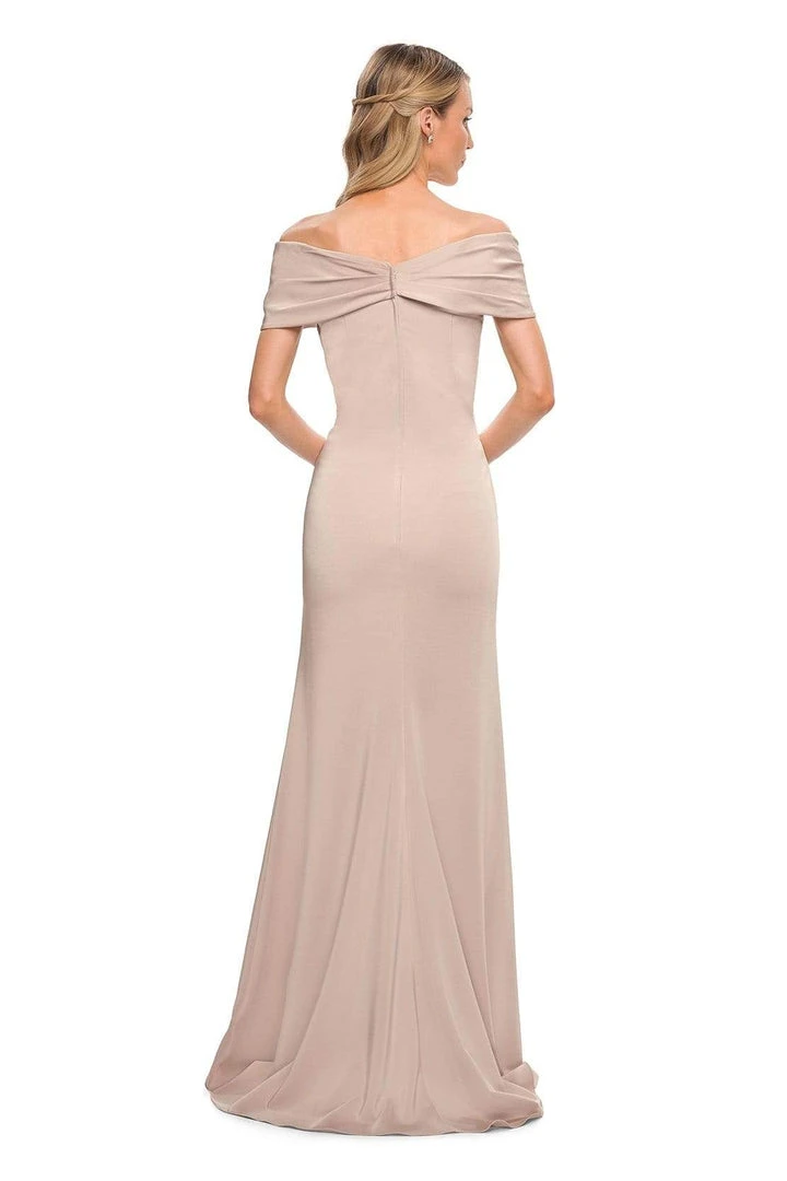 This dress highlights a pleated off shoulder neckline supported by short off shoulder sleeves in a fitted bodice with princess seams. The skirt reveals a sheath silhouette while the back shows a mid-open back with back zipper closure to complete the look.