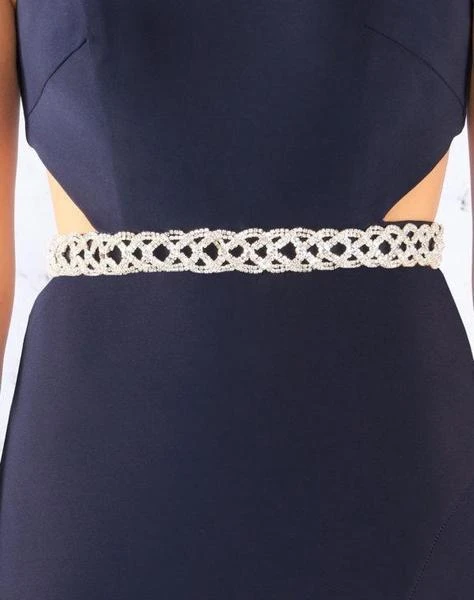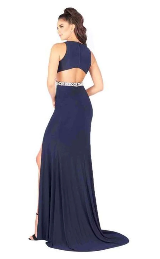 | Details: | Sleeveless, Fitted bodice, Jersey, Side cutouts, Rhinestone waistband, Sheath skirt, Thigh high slit, Sweep train |