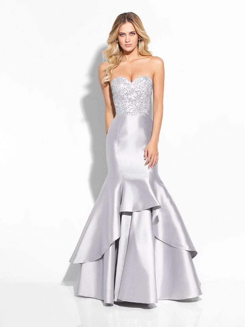 A high-low ruffle adds dimension to this satin-finish Mikado gown.