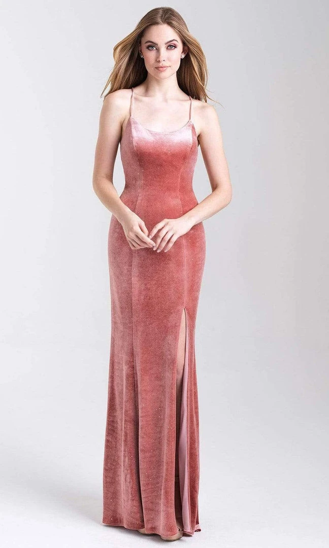 Reveal hidden charms in this lovely evening gown by Madison James 20-337. This sparkle velvet dress features a sleeveless, scoop neckline with spaghetti straps. The fitted bodice is styled with a strappy back and a zipper closure. The skirt has a flattering sheath silhouette with a leg slit and a sweep train finish. Paint a picture of pure grace as you channel your inner celebrity style with Madison James.