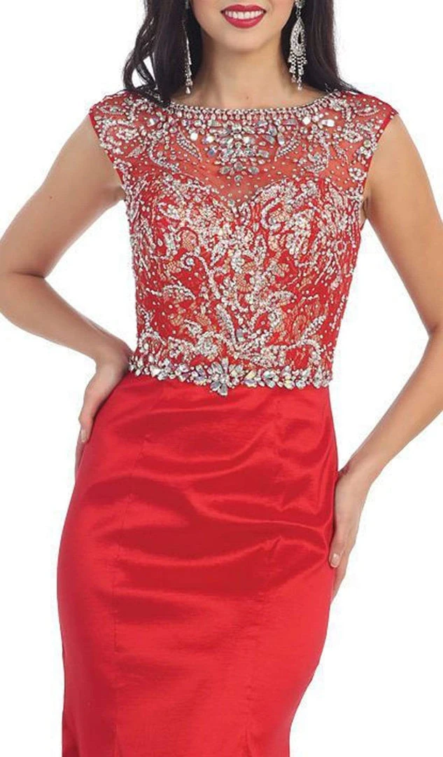 Look immaculately gorgeous when you don in this glamorous masterpiece from May Queen MQ 1119. An illusion bateau neckline with sheer cap sleeves top this evening gown. Crystal embellishments beautifully adorn the bodice which will make you sparkle from the crowd. Fitted through the hips, the skirt flares elegantly to the floor finished off with a sweep train adding a dramatic touch. An apparent V cut highlights the back with a center zipper closure that secures the ensemble. Bring on the glam with this May Queen creation.