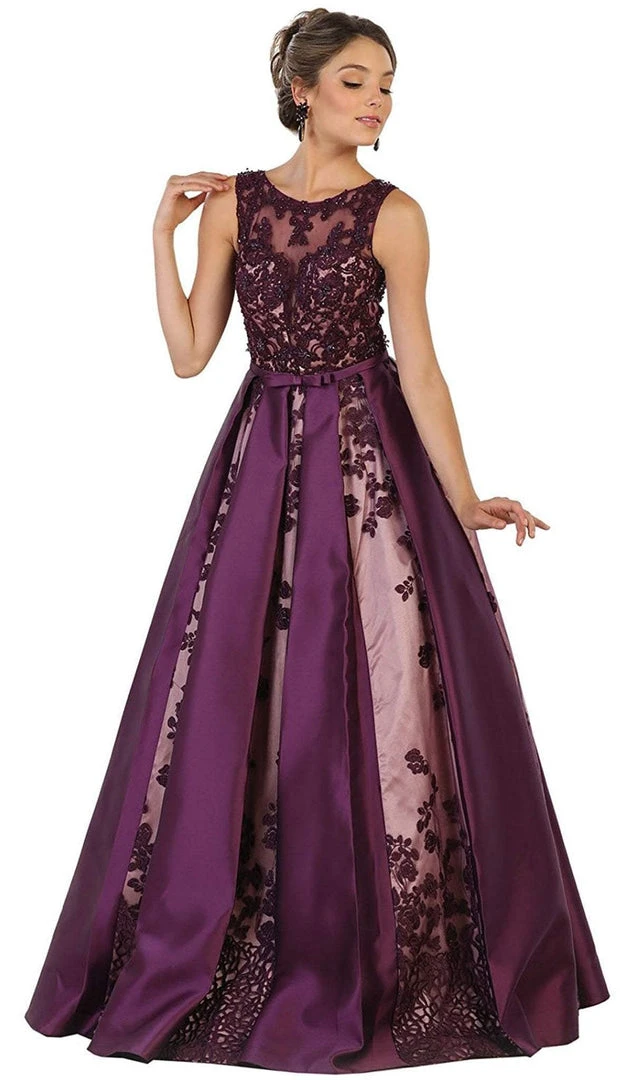 Set the tone for the night wearing this May Queen RQ7516 evening gown. Sleeveless, bateau styling with an illusion neckline debut the bodice while slender bow secure the center front. A trim fit details bust and midriff, and embroidered florals add sparkling adornment. Soft inverted pleats shape the expansive, full-length skirt for a fluttering finish. Flaunt your flair for fashion in this May Queen creation.