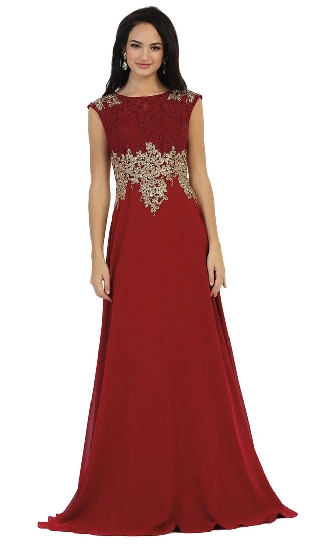 Make your grand entrance in this long formal by May Queen MQ1460. Features cap sleeves and an illusion bateau neckline. The top is lavishly ornate with lace appliques and gild embellishments. The skirt runs in full length hem and flares an A-line silhouette finishing a sweep train. This May Queen look is sure to be an attention-grabber in any occasion.