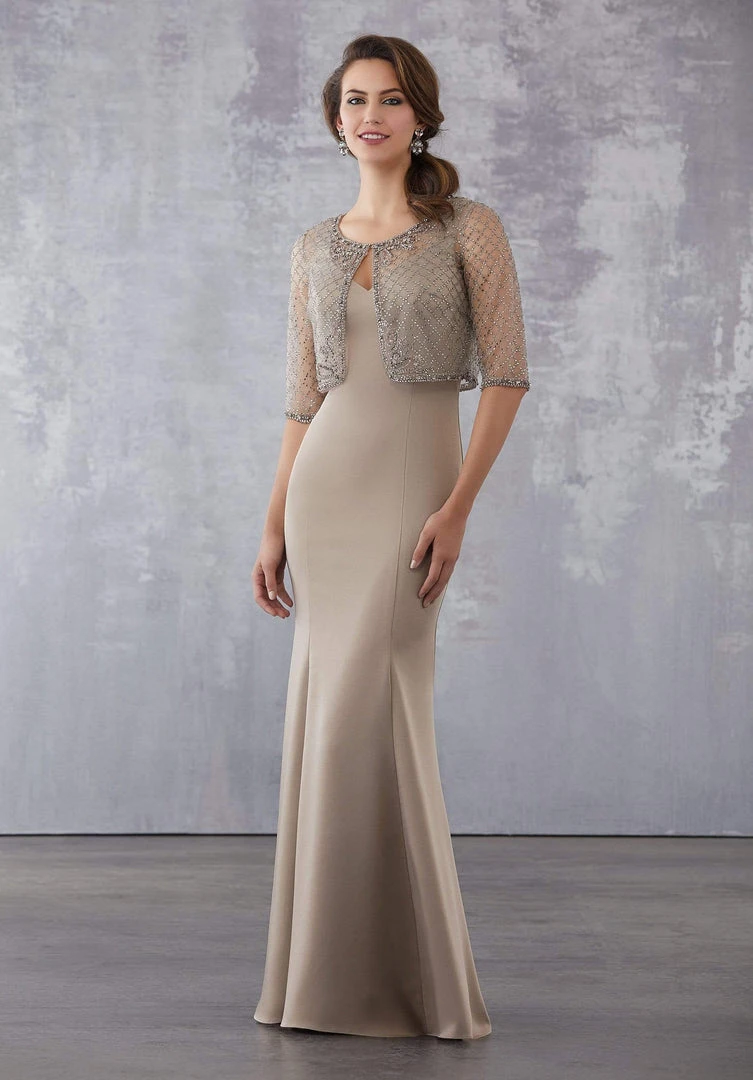 Make an extraordinary statement when you walk in this classy dress by MGNY By Mori Lee 71732. This long dress features a sleeveless, v-neckline with fitted bodice styled with visible seams. The trumpet skirt finishes in a sweep train. The dress is tailored with a matching embellished jacket. This trendsetting dress is sure to get you noticed.