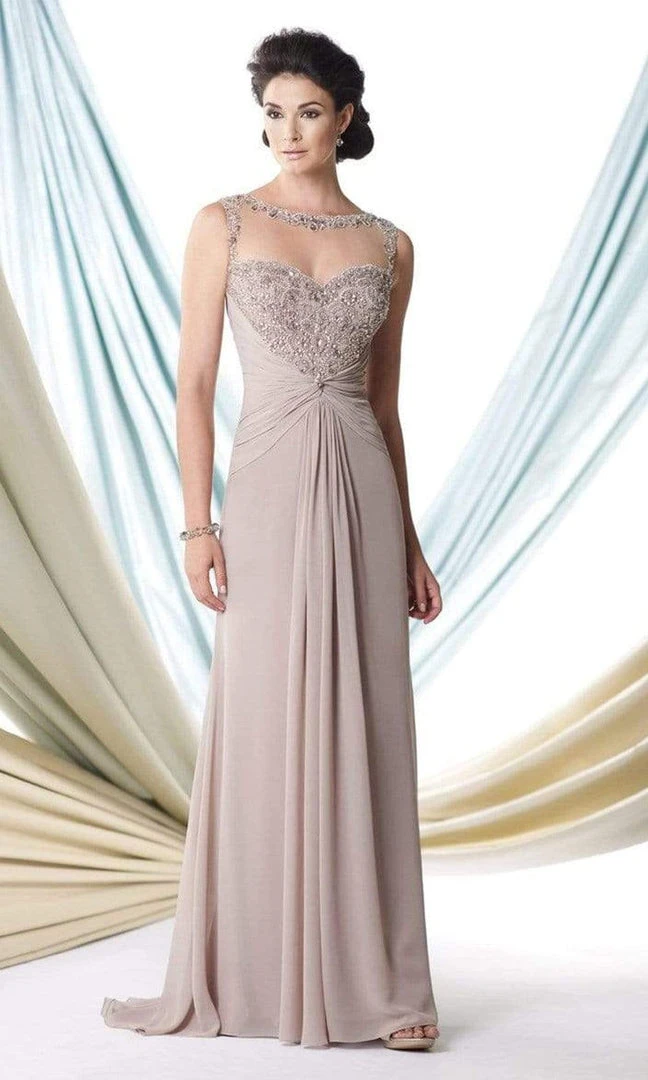 Sleeveless chiffon A-line dress with illusion bateau neckline trimmed with ornate hand-beading, sweetheart bodice encrusted with beading features an unique beaded illusion racer back, midriff and skirt gathered at center, sweep train, suitable as a dress to wear to a wedding. Matching shawl included.