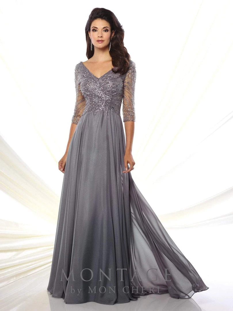 This long gown is made of diamond chiffon fabric with hand-beaded quarter length sleeves. It has a front and back V-neckline with bodice embellished with beading. The skirt flares a full length A-line silhouette with a sweep train finish. Model is wearing Gray/Heather color.