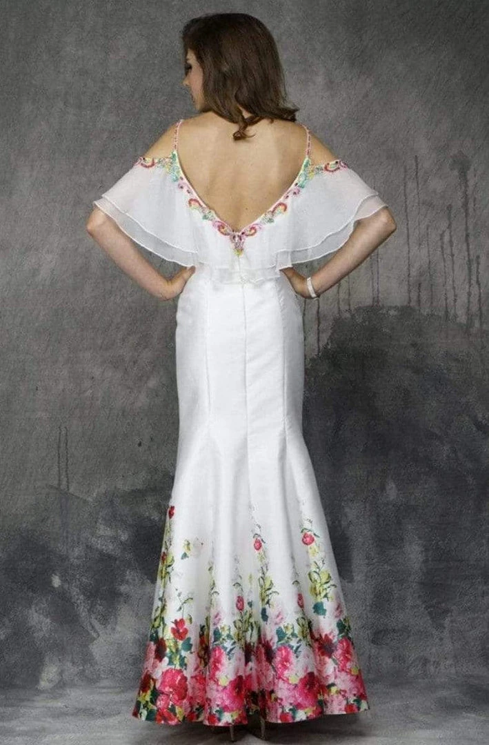 | Details: | Multi-colored beads, Ruffles, Cutaway shoulders, Low V-back, Back zipper, Sheath skirt, Floral print, Side slit, Princess seams |