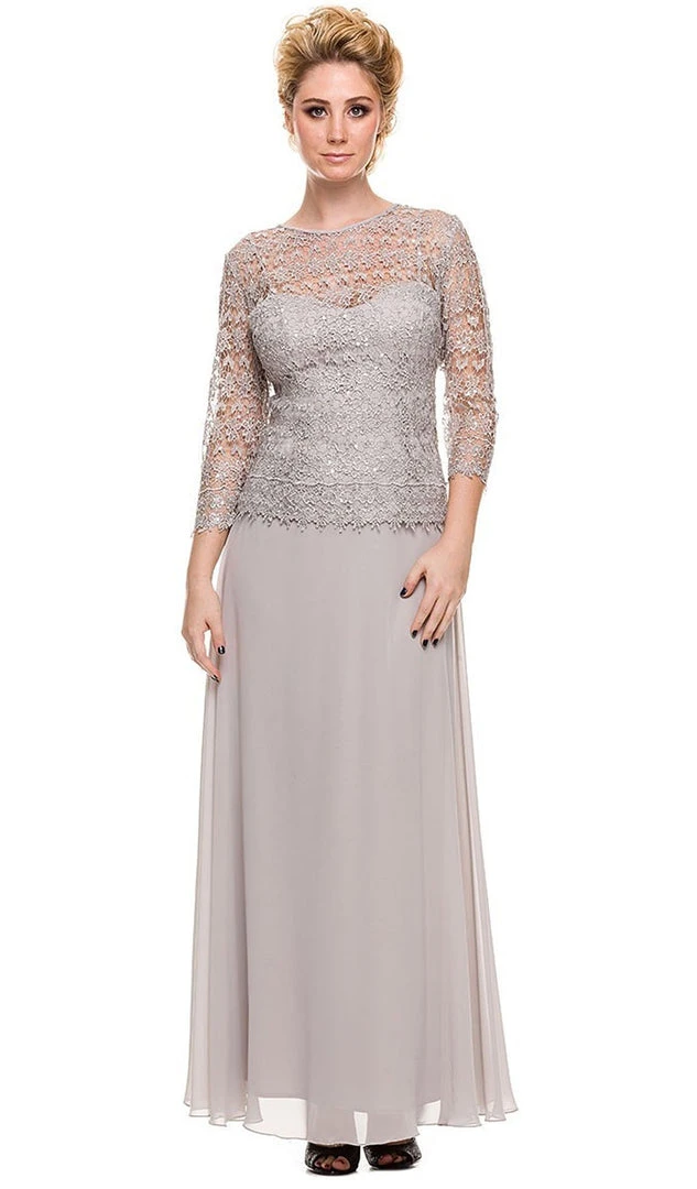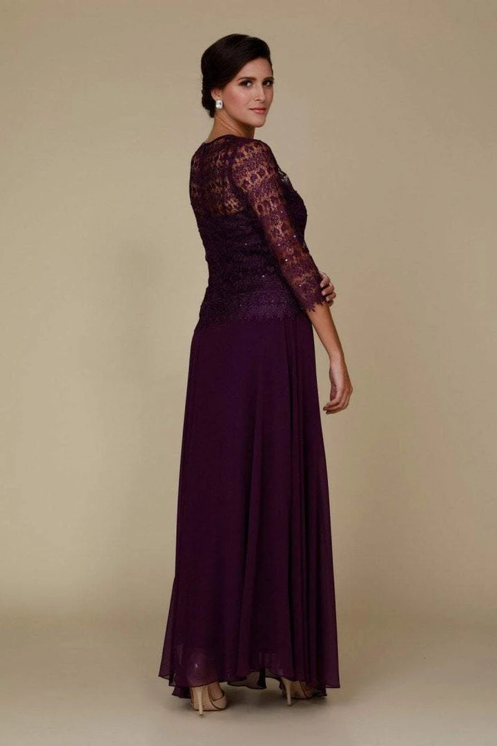 Look great at your next formal event wearing Nox Anabel 5083 Mother of the Bride Dress style. This dress features a lace overlay top with jewel neckline and quarter sleeve. Visible sweetheart inner-lay defines the fitted bodice. The skirt is smooth with a soft flared shape. This gown finishes with a full length hem. This elegant design by Nox Anabel looks good for any party or wedding event.